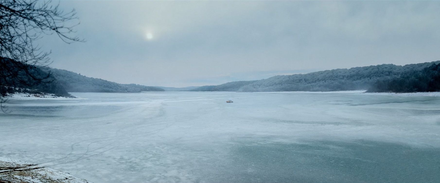 Stary amfiteatr, położony w parku obok zamku w Lesku. Drewniany dach rozciąga się nad białym ekranem kina letniego. Na stoku przed sceną znajdują się ławki dla widowni.